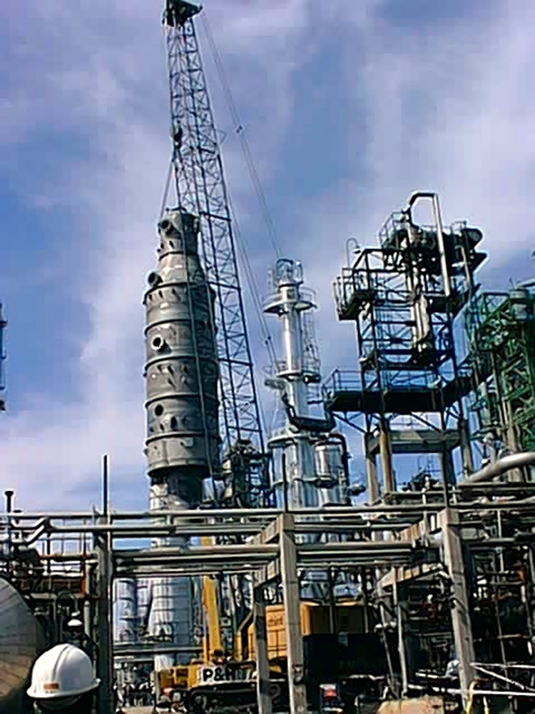 Suministro de torre de destilación por vacío de Topping, de 18m de alto y 3.8m de diámetro, fabricada en acero inoxidable. Diseño y fabricación según ASME BPVC Vol.VIII División 1